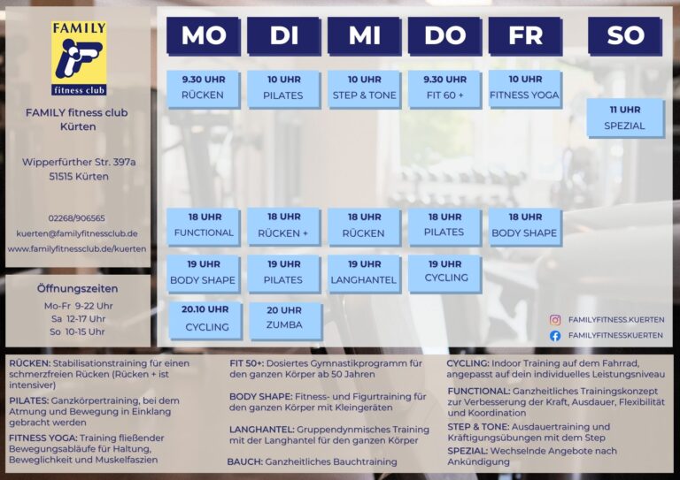 Ab sofort ist die Anmeldung zu den Präventionskursen geöffnet. Alle Präventionskurse umfassen 8 Trainingseinheiten, jeweils 60 Minuten. Die Kursgebühr beträgt 100 Euro. Die Krankenkasse übernimmt 75 % der Kursgebühr